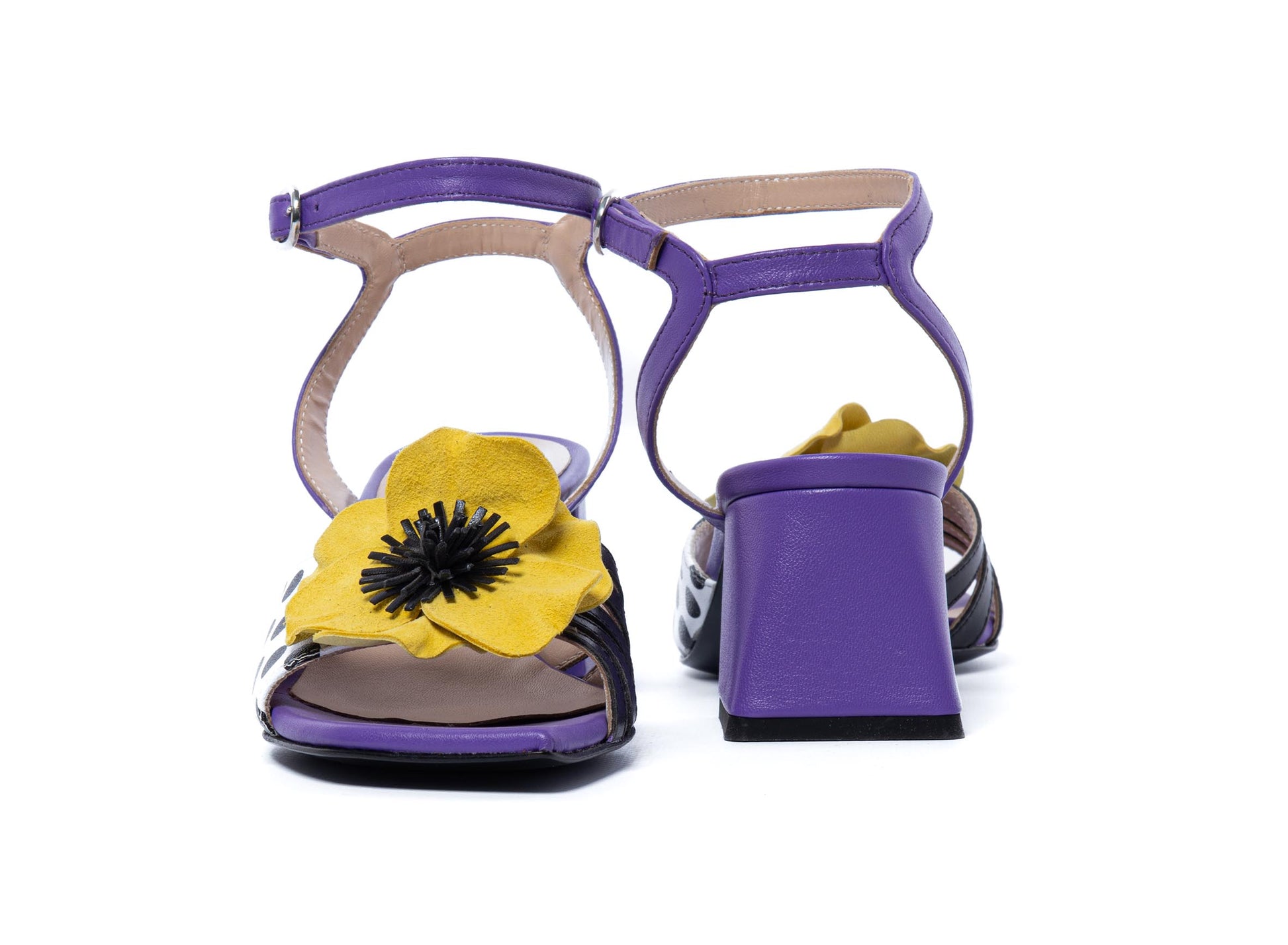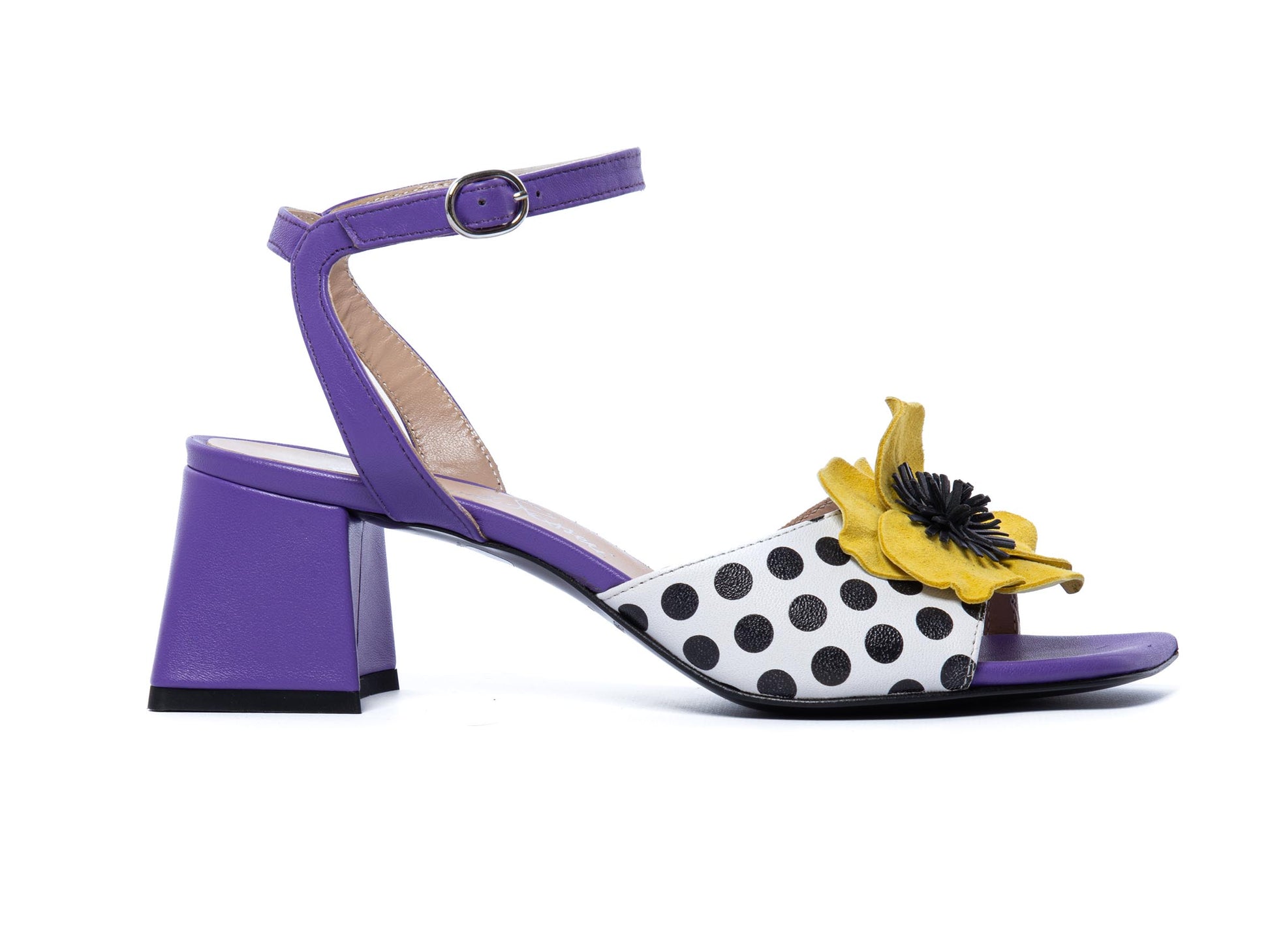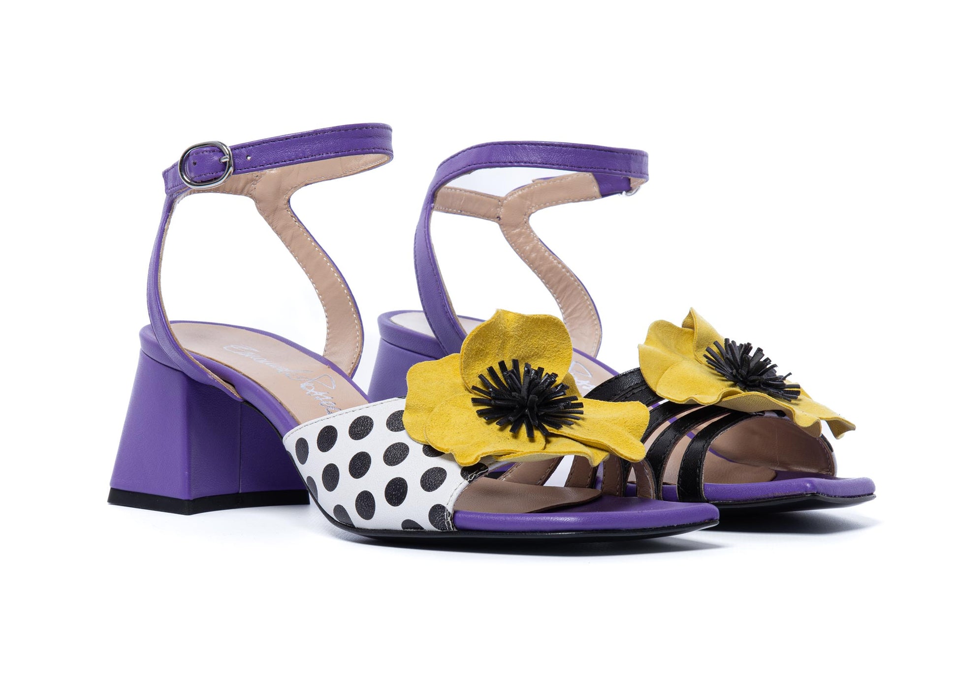 Sandalo in pelle di Emanuela Passeri, dal gusto glamour e dal design creativo: la fascia, che nella sua parte esterna si presenta color bianco a pois neri e nella parte interna del piede si trasforma in fascette nere che avvolgono appunto la pianta, ha applicato sopra un fiore fatto a mano in camoscio con petali gialli e centro nero – Cinturino sottile color viola, che avvolge la caviglia con fibbietta nickel free, sottopiede e tacco largo dalla forma svasata rivestiti dello stesso colore e materiale – Tacco h 6 cm, sottopiede h 1 cm, fodere in pelle e suola color nude di vero cuoio italiano.